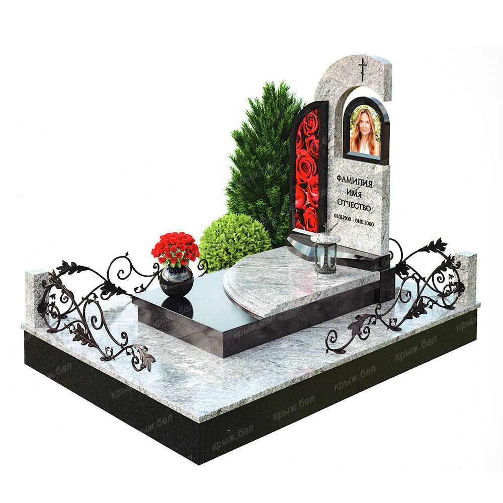 Мемориальный комплекс выполнен из двух видов гранита: габбро-диабаз и Viscont White. Элементы декора в цвете серебра прекрасно дополняют комплекс, а кованая ограда придает комплексу завершенный вид. Данный комплекс может быть выполнен в различных видах гранита.