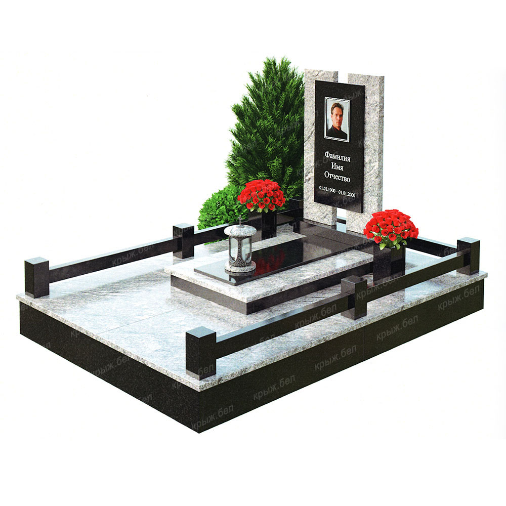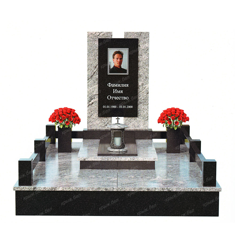 Мемориальный комплекс выполнен из двух видов гранита: габбро-диабаз и Viscont White. Элементы декора в цвете серебра прекрасно дополняют комплекс, а гранитная ограда придает комплексу завершенный вид. Данный комплекс может быть выполнен в различных видах гранита.