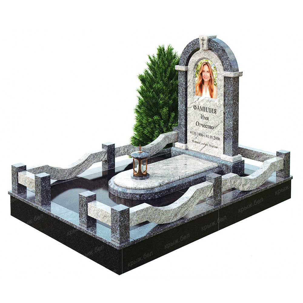 Мемориальный комплекс выполнен из двух видов гранита: Viscont white и Blue pearl. Лампада с элементами бронзы прекрасно дополняет комплекс, а гранитная ограда придает комплексу завершенный вид. Данный комплекс может быть выполнен в различных видах гранита.