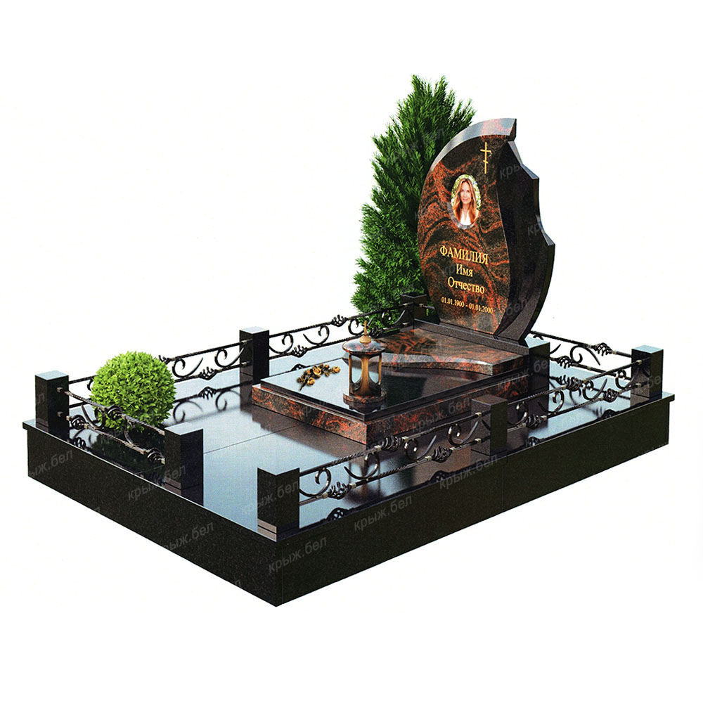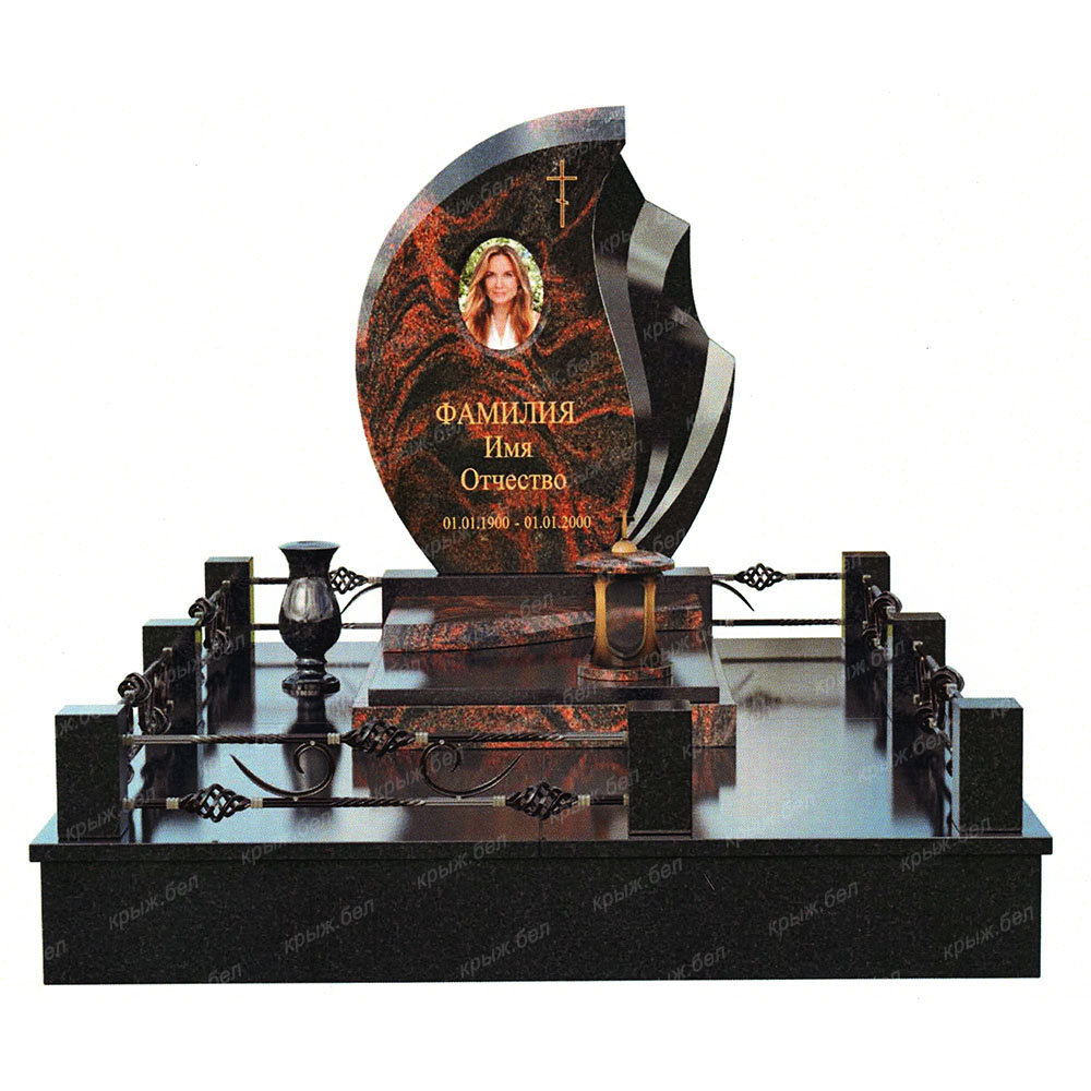 Мемориальный комплекс выполнен из двух видов гранита: габбро-диабаз и аврора. Элементы декора в цвете бронзы прекрасно дополняют комплекс, а кованая ограда придает комплексу завершенный вид. Данный комплекс может быть выполнен в различных видах гранита.