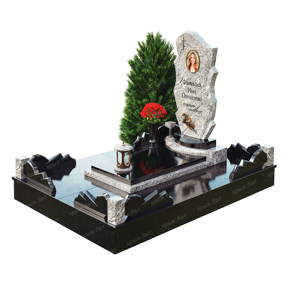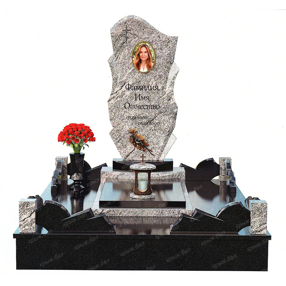 Мемориальный комплекс выполнен из двух видов гранита: габбро-диабаз и Viscont White. Элементы декора в цвете бронзы прекрасно дополняют комплекс, а гранитная ограда придает комплексу завершенный вид. Данный комплекс может быть выполнен в различных видах гранита.